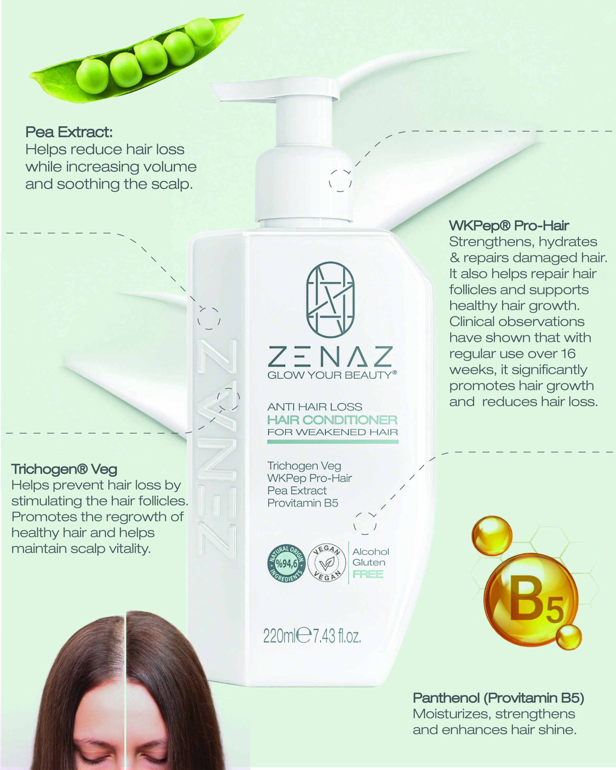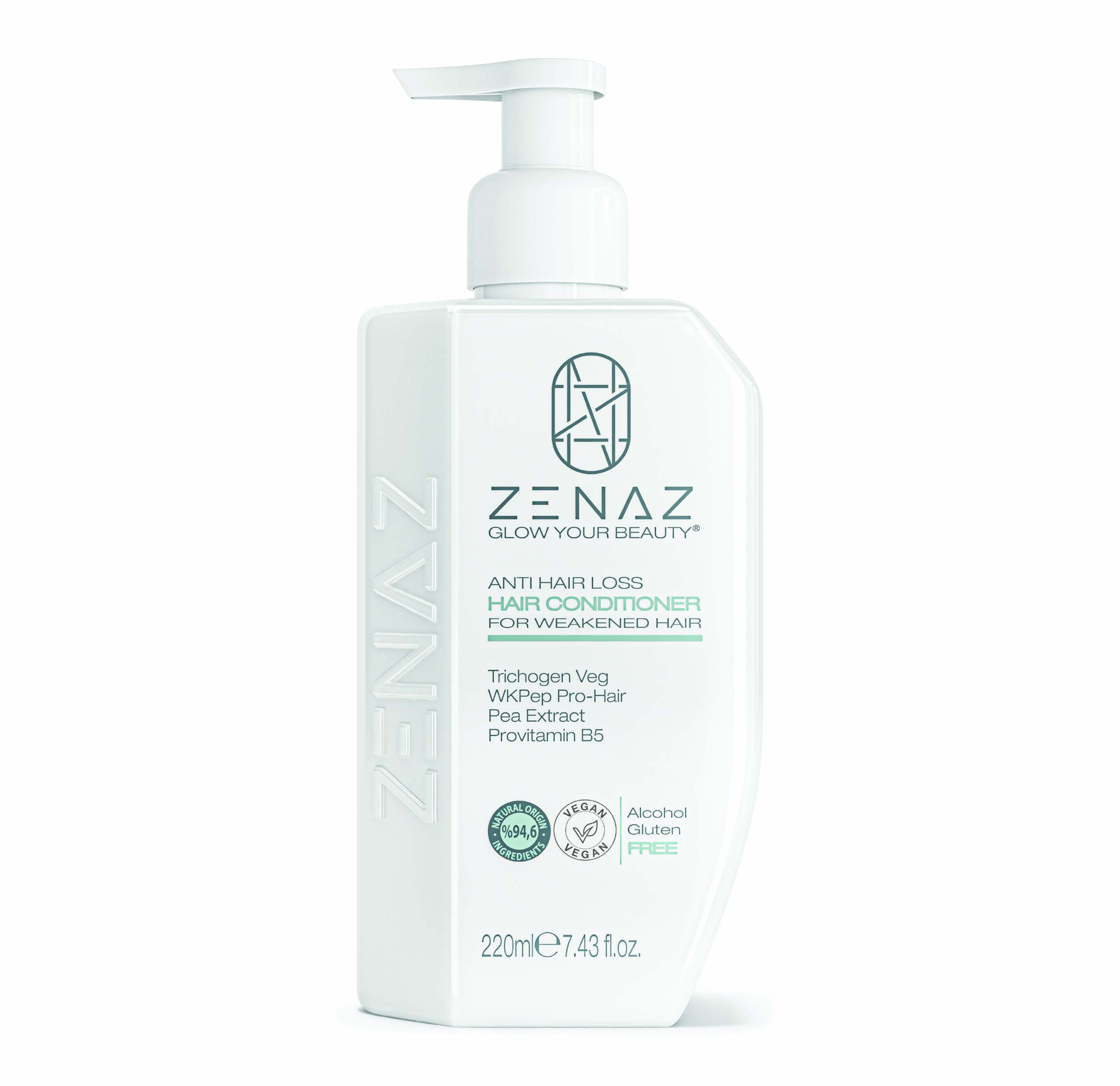 Zenaz Anti Hair Loss Hair Conditioner is a special ingredient that nourishes the hair roots and strengthens weak hair due to the Trichogen® Veg in its content. It is especially effective against hair loss problems due to environmental factors. The active peptide and Crysin in the WKPep® Pro-Hair structure contribute to preventing hair loss. It increases hair density and thickness. Powerful antioxi- dants, vitamins, minerals and proteins in the structure of “Pea Extract penetrate weak, brittle and damaged hair, support the formation of healthier and stronger hair strands, help reduce hair breakage and loss. Provitamin B5 moisturizes dry hair by regulating the moisture balance of the hair, thus helping to repair dry and brittle hair. The formula enriched with the combination of soy protein and pep- tides strengthens the structure of the hair, while repairing and revitalizing the split ends.