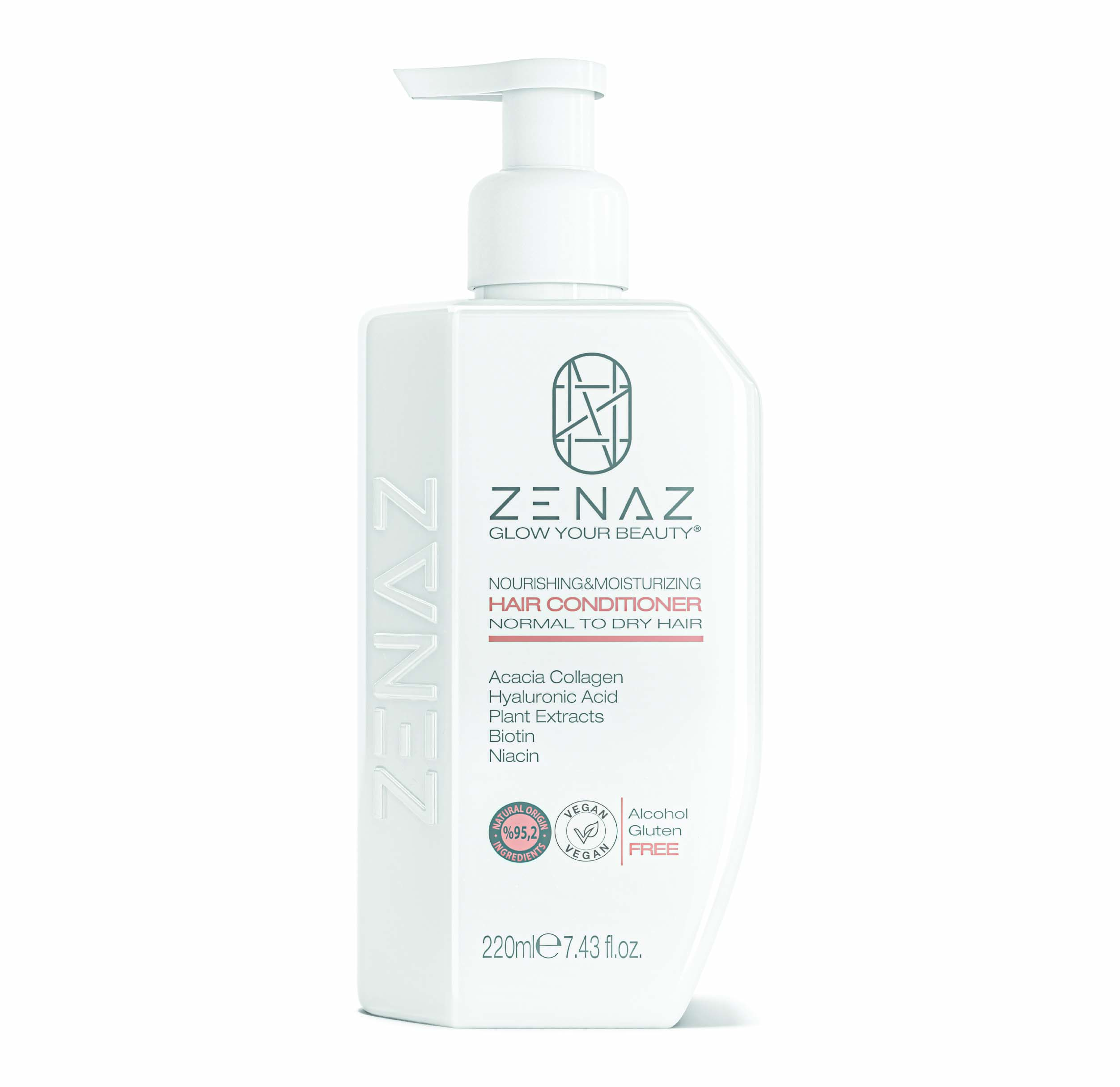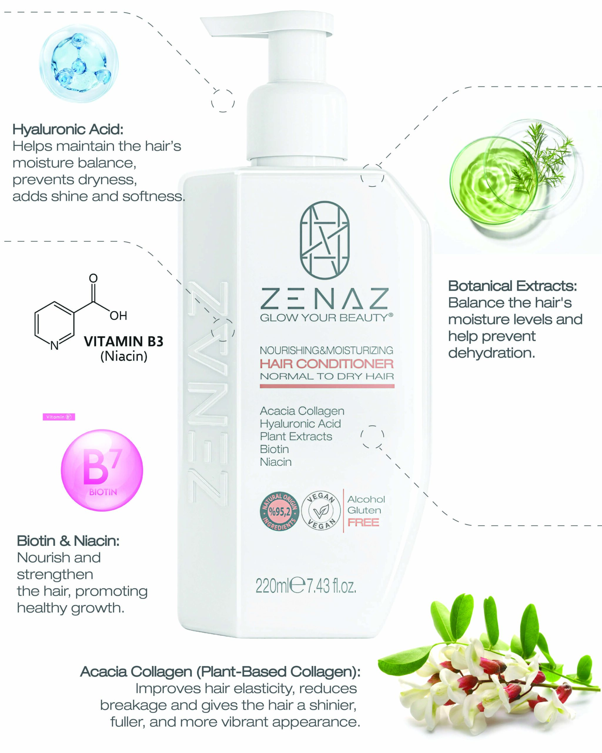 Zenaz Nourishing & Moisturizing Hair Conditioner *Acacia Collagen in its con- tent nourishes the hair follicles and strengthens the hair. It provides elasticity to the hair and reduces breakage. “Hyaluronic Acid and *Aloe Vera Extract sup- port the softness of the hair strands with their intense moisturizing properties, help retain moisture in the hair and give volume and fullness to the hair. *Salvia (Sage) Extract and *Chamomile Extract nourish the hair and add shine to dull and lifeless hair. Biotin and Niacin ensure healthier growth.