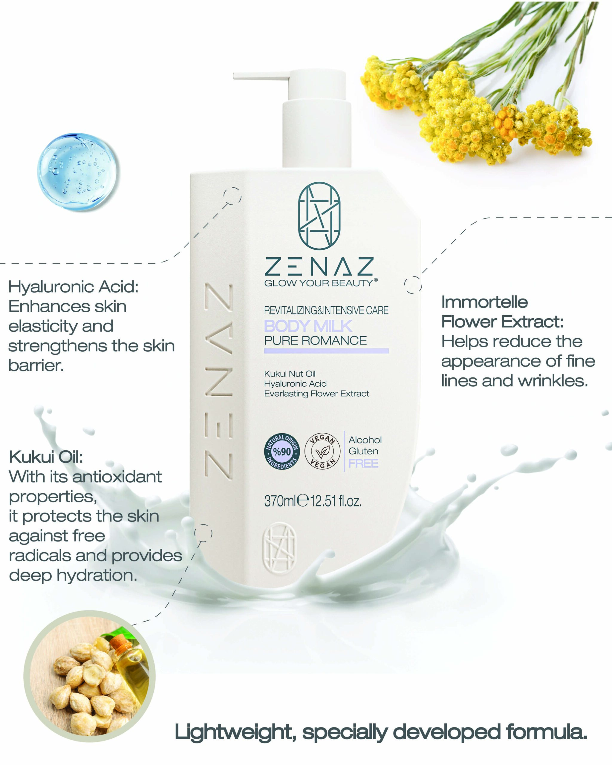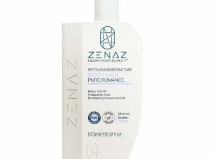 Zenaz Pure Romance Body Milk, the *Kukui Nut Oil in its content, protects the skin against free radicals with its antioxidant properties and deeply moisturizes the skin. *Hyaluronic Acid provides moisture balance of the skin. *Everlasting Flower Extract helps reduce the appearance of light lines and wrinkles on the skin by increasing skin elasticity. With its special fine-structured formula, it is absorbed quickly without leaving an oily feeling. It is suitable for all skin types and is ideal for especially dry and sensitive skin.